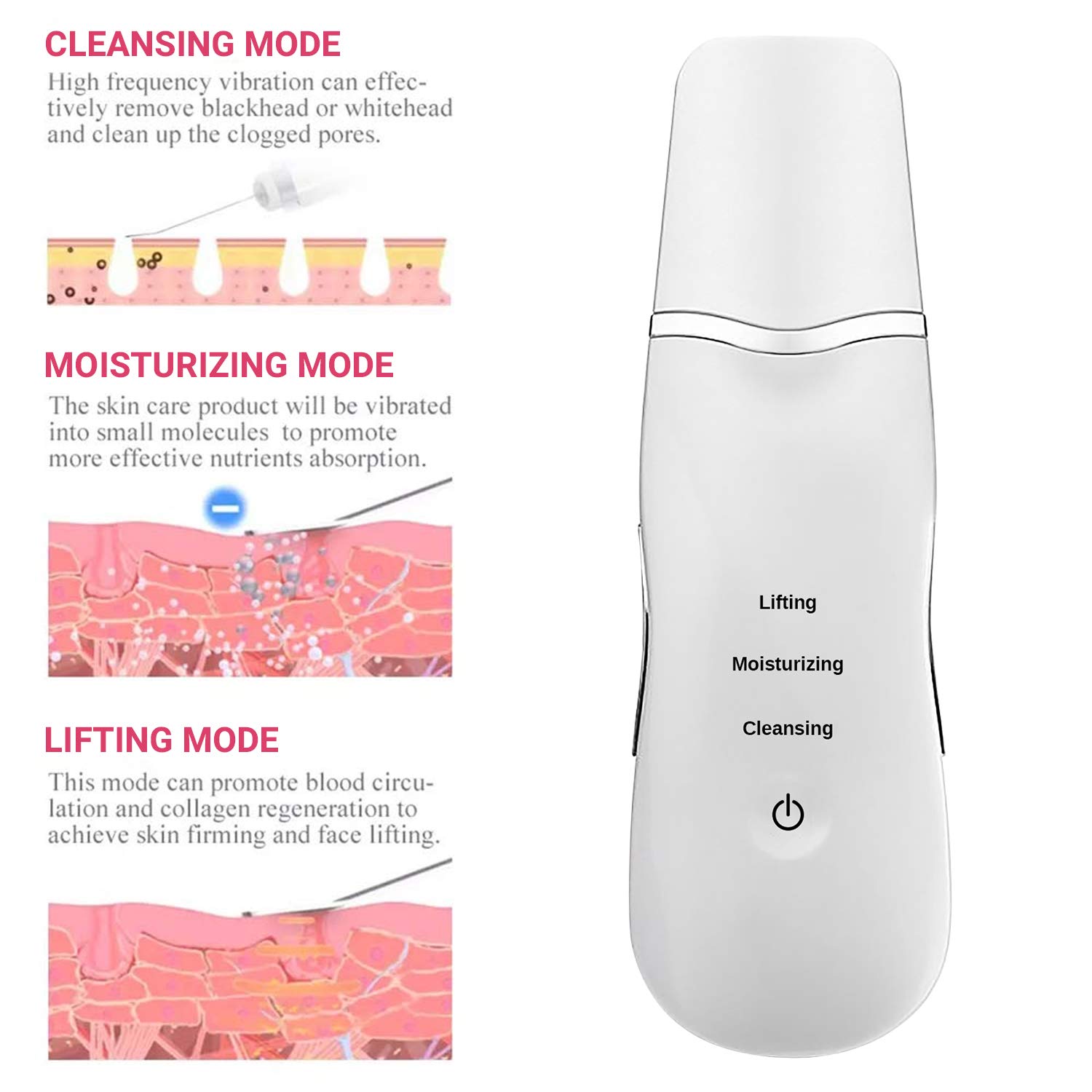 Ultrasonic Cleansing: Utilize high-frequency vibrations to gently yet effectively cleanse your skin. The ultrasonic waves help to dislodge and remove dirt, oil, and impurities from deep within pores, promoting a clearer and healthier complexion. Blackhead Removal: The ultrasonic shovel helps to target and lift stubborn blackheads and whiteheads. By gently exfoliating the skin, it helps to reduce their appearance and prevent new ones from forming. Skin Lifting and Firming: Experience a rejuvenating facial treatment as the machine’s ultrasonic waves stimulate collagen production. This results in improved skin elasticity, reduced fine lines, and a firmer, more youthful appearance. Exfoliation and Peeling: The exfoliating function gently removes dead skin cells, revealing a smoother and more even skin texture. Regular use helps to brighten and renew your complexion, making it look fresh and vibrant. Rechargeable and Portable: Designed with convenience in mind, this device is rechargeable, ensuring you’re always ready for your skincare routine. Its portable design makes it easy to use at home or on the go.